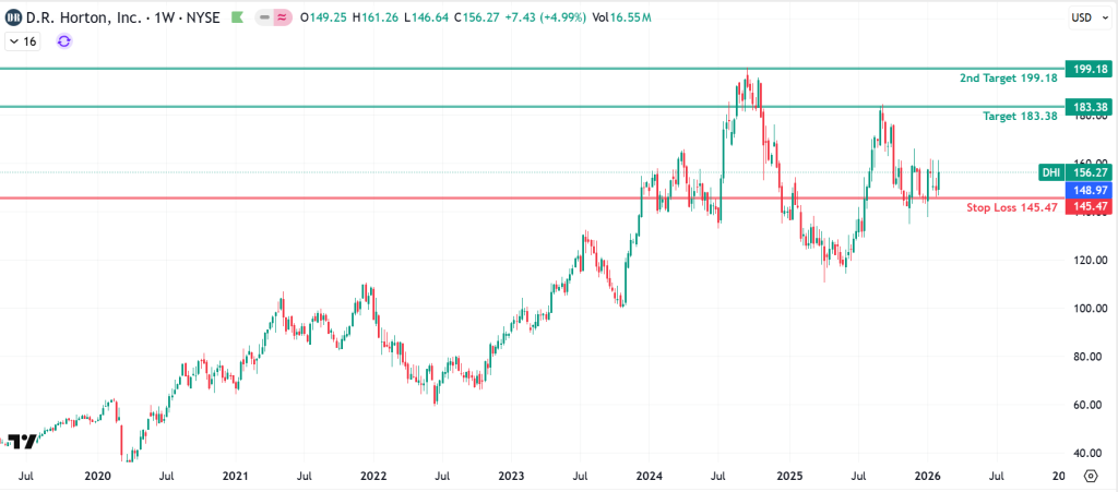 We’ve got another pick for you: D.R. Horton, Inc. (DHI). The stock wrapped up last week at 156.27. Looking ahead, we think it could climb to around 183.38 in the next few weeks and maybe even hit 199.18 after that. If you’re considering this stock, it might be wise to set a stop loss at 145.57 to manage your risk.