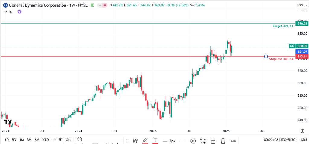 Our third stock pick is General Dynamics Corporation (GD). Right now, the stock is close to its all-time high, and both the weekly and long-term charts look pretty positive. We are setting a target price of 396.51, and we’ll keep a stop loss at 343.14 just in case.